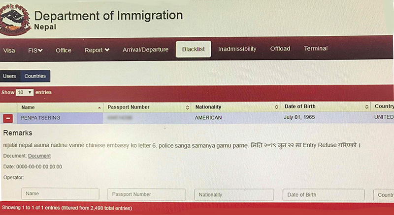 This screenshot image of webpage of Department of Immigration, Nepal shows American national Penpa Tsering on blacklist.