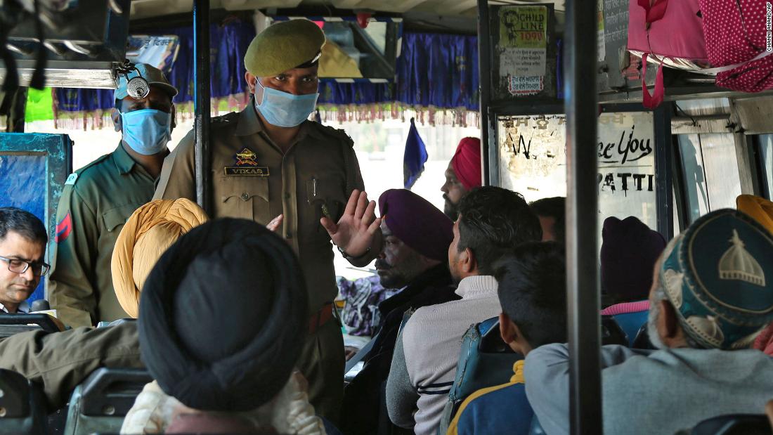 Indian police man wearing surgical masks and talk to passangers for aware for coronavirus at screening camp in lakhanpur 92 kms from Jammu, India, Wednesday, March.4, 2020. Rohit Kansal, Jammu and Kashmir Principal Secretary informed that no positive case has been reported and entire administrative machinery, including health machinery is in full alert. "21 suspected cases have been tested so far and no positive case has been reported so far across Jammu and Kashmir.(AP Photo/Channi Anand)