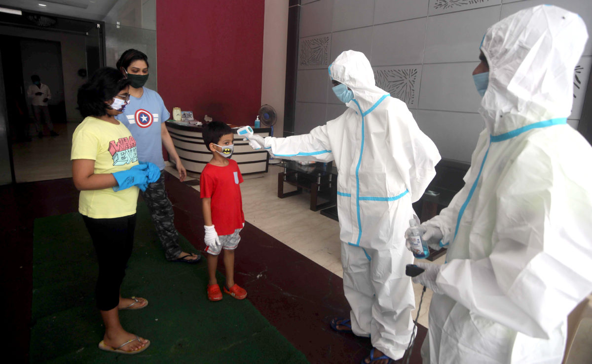 Maharashtra, July 18(ANI): Health workers wearing PPE kit check the temperature, blood oxygen screening of a child for COVID-19 symptoms at a residential building at Adarsh Nagar area of Malad, in Mumbai on Saturday. (ANI Photo)