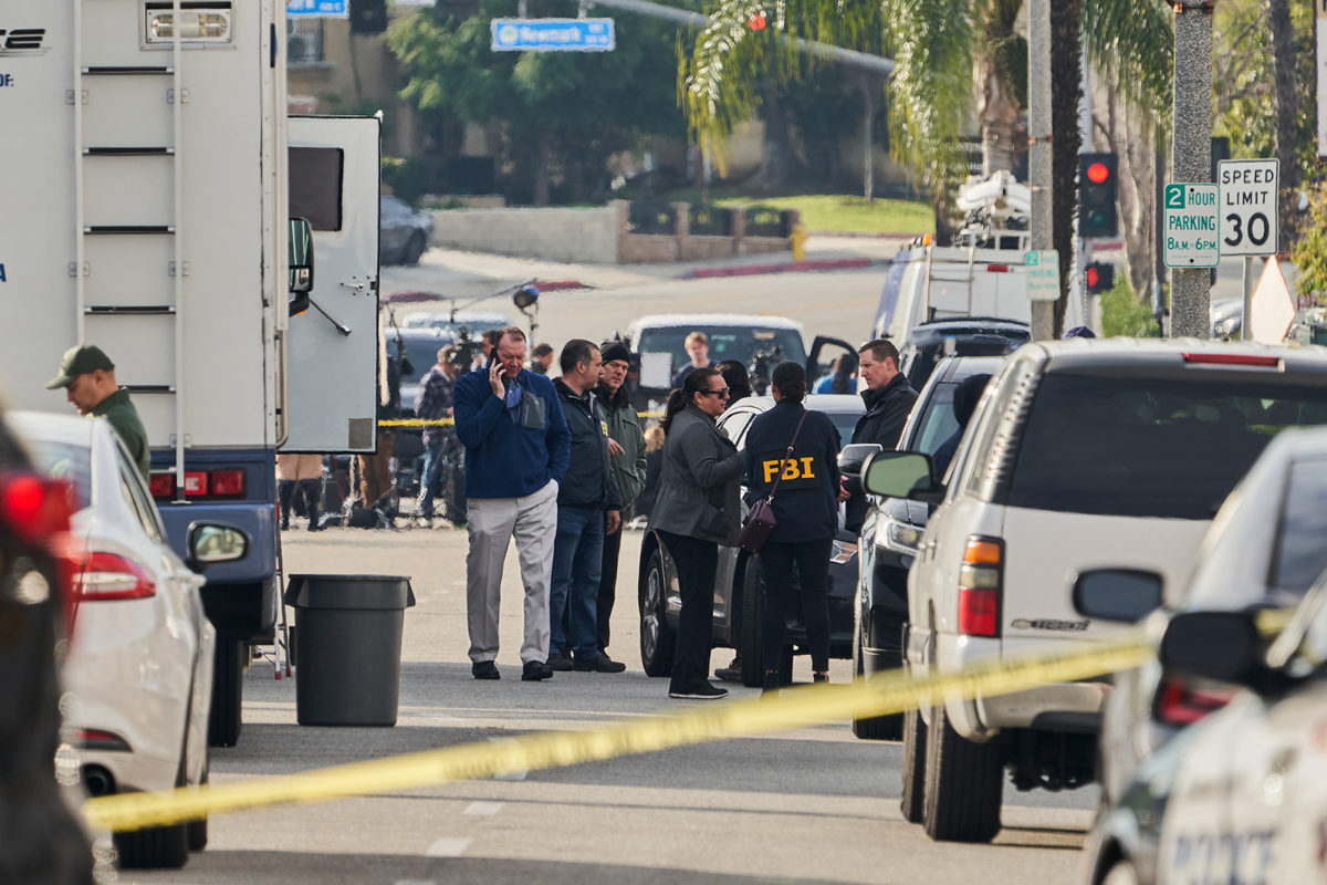 MONTEREY PARK, CA - January 22: FBI investigators stand near the Star Dance Studio (not pictured) where a gunman killed 10 people and injured another 10 in Monterey Park, California on January 22, 2023. The shooting happened in the evening of January 21. (Photo by Philip Cheung for The Washington Post via Getty Images)