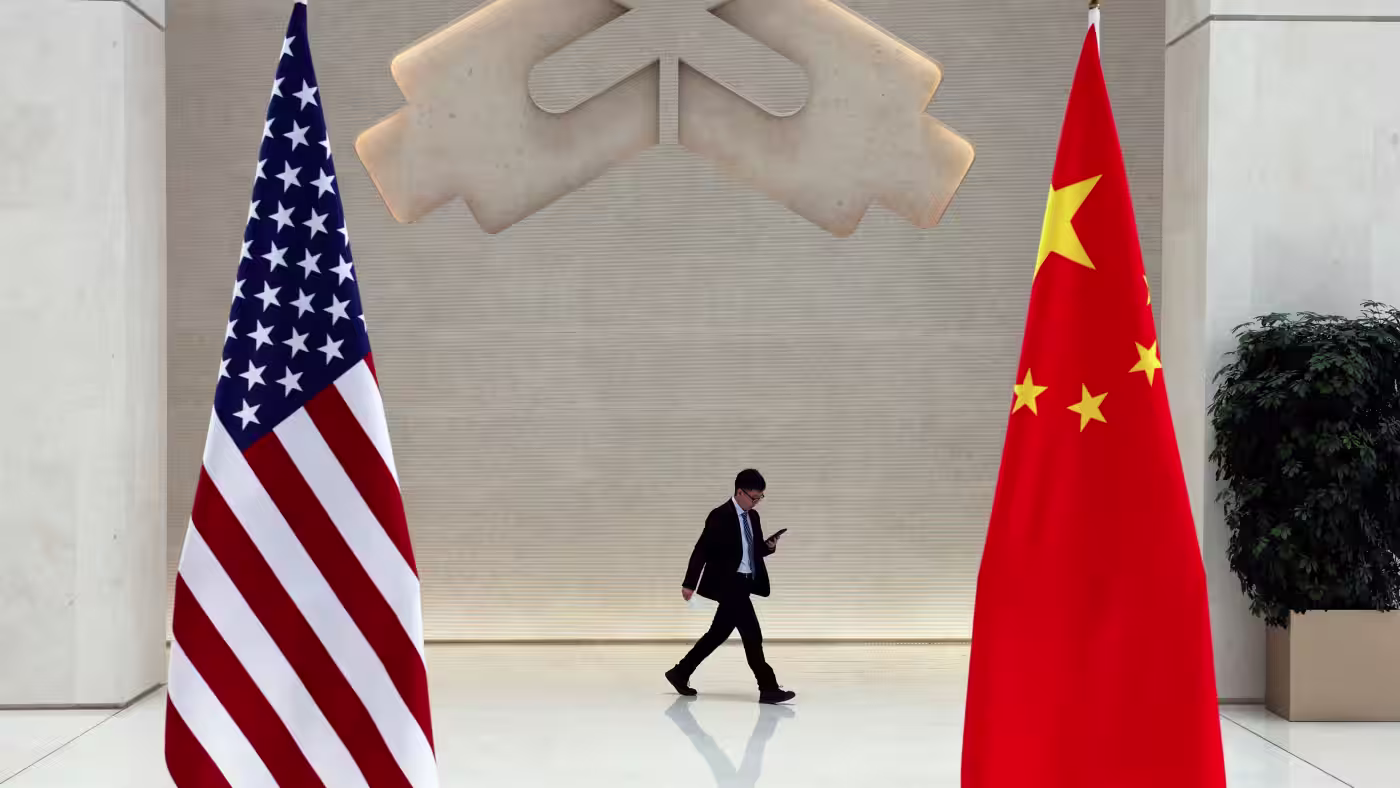 A man walks past U.S. and Chinese flags on the day of a meeting between U.S. Treasury Secretary Janet Yellen and People’s Bank of China Gov. Pan Gongsheng in Beijing on April 8. © Reuters