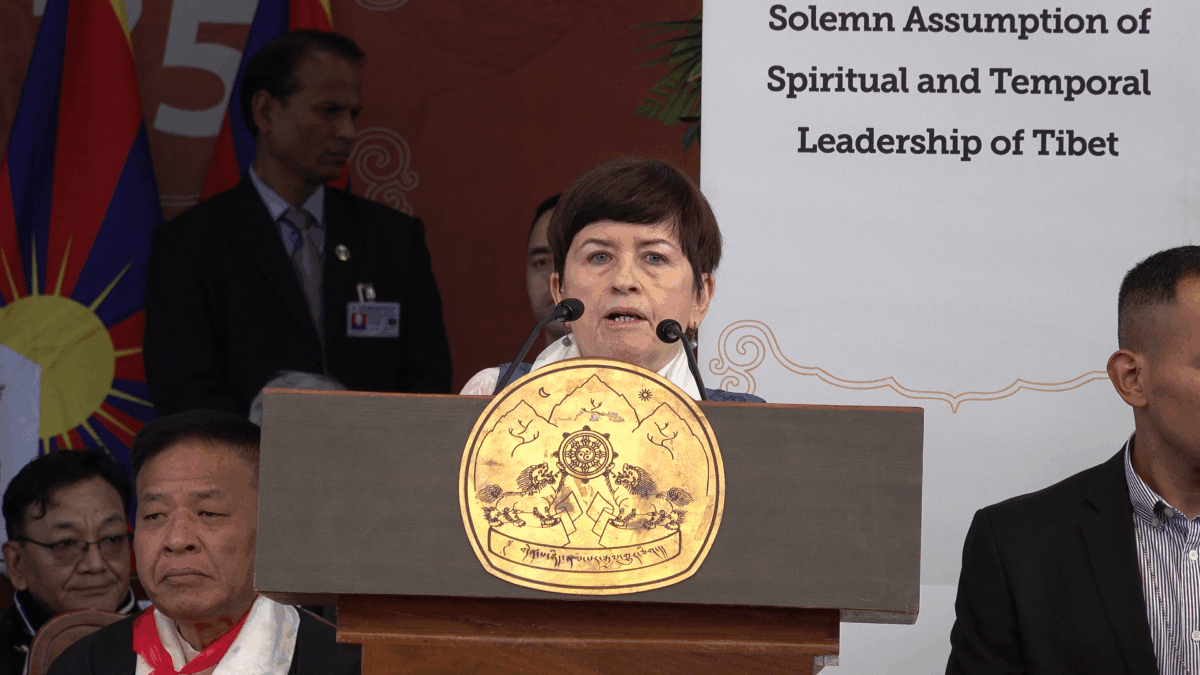ཅེག་སྤྱི་མཐུན་རྒྱལ་ཁབ་ཀྱི་རྒྱ་གར་གཞུང་ཚབ་མ་ལྕམ་ཨལ་སི་ཀ་ཛི་གྷོ་བ་ (Eliska Zigova) ལགས་ཀྱིས། དེ་རིང་ང་༧གོང་ས་རྒྱལ་བ་རིན་པོ་ཆེ་མཆོག་ནས་བོད་རྒྱལ་ཁབ་ཆེན་པོའི་རྒྱལ་སྲིད་ཆོས་སྲིད་ལུགས་གཉིས་ཀྱི་ཐུགས་འགན་ཡོངས་སུ་བཞེས་ཏེ་མི་ལོ་ ༧༥ འཁོར་བའི་དམིགས་བསལ་གྱི་ཉིན་མོར་བཅར་རྒྱུ་བྱུང་བར་དགའ་སྤྲོ་ཚད་མེད་བྱུང་། ངས་གཏམ་བཤད་མ་བྱེད་པའི་གོང་དུ། ངས་འགན་ཁུར་གྱི་འདུ་ཤེས་ཟེར་ན་ཅི་ཞིག་ལ་ཟེར་གྱི་ཡོད་མེད་དང་། ང་ཚོ་འགྲོ་བ་མི་ལ་མཚོན་ན་འགན་ཁུར་གྱི་འདུ་ཤེས་ཟེར་བ་དེ་གང་འདྲ་ཞིག་ལ་གོ་དགོས་མིན་ཐད་མདོར་ཙམ་ཞུ་འདོད་བྱུང་། ངས་ང་ཚོ་འགྲོ་བ་མི་ཞིག་ལ་མཚོན་ན་འགན་ཁུར་གྱི་འདུ་ཤེས་ལྡན་པའི་རླབས་ཆེན་གྱི་མགོ་ཁྲིད་ཅིག་དགོས་པར་ཚང་མས་རྒྱབ་སྐྱོར་བྱེད་པའི་ཡིད་ཆེས་ཡོད། དཔེར་ན་ནང་མི་ཞིག་ལ་མཚོན་ན། ཕ་མ་གཉིས་ཀྱིས་བུ་ཕྲུག་ལ་གཅེས་སྐྱོང་བྱས་ཚེ། ཕ་མ་གཉིས་ཀྱི་འགན་ཁུར་གྱི་འདུ་ཤེས་ལྡན་པའི་ལམ་སྟོན་དང་། བརྩེ་འདང་སོགས་ལས་བུ་ཕྲུག་རྣམས་ཡར་རྒྱས་གོང་འཕེལ་གྱི་ལམ་སྣེ་རུ་འདྲེན་ནུས། དེ་བཞིན་སློབ་གྲྭ་ཞིག་ལ་མཚོན་ནའང་། འགན་ཁུར་གྱི་འདུ་ཤེས་རང་བཞིན་ལྡན་པའི་དགེ་རྒན་ཚད་ལྡན་ཞིག་གི་མཐུ་འོག་ནས། སློབ་སྦྱོང་ཡར་སྐྱེད་དང་སྦྱོང་འདུན་སྐྱེས། དེ་བས་རྒྱལ་ཁབ་དང་མངའ་སྡེ་ཞིག་ལ་མཚོན་ནའང་། འཐུས་མི་དང་འགན་ཁུར་གྱི་འདུ་ཤེས་ལྡན་པའི་མགོ་ཁྲིད་ཅིག་གིས་རྒྱལ་ཁབ་དང་མངའ་སྡེ་སོགས་སྣེ་འདྲེན་བྱ་རྒྱུ་ཧ་ཅང་གལ་གནད་ཆེན་པོ་རེད། དེ་ལས་ལྡོག་ནས་ང་ཚོ་ལ་མགོ་ཁྲིད་ཚད་ལྡན་ཞིག་མེད་ན། ང་ཚོའི་མིག་ལམ་དུ་མངོན་པ་བཞིན་དེང་སང་སྤྱི་ཚོགས་ཀྱི་གྲུ་ཟུར་རེ་རེར་ཡོད་པའི་འགན་ཁུར་གྱི་འདུ་ཤེས་ལྡན་པའི་མགོ་ཁྲིད་རྣམས་ལ་གྲུབ་འབྲས་མི་ཐོན་པའི་དུས་ཤིག་ཡིན་པ་ཇི་བཞིན་ཆགས་ཀྱི་རེད། དེའི་དབང་གིས་ང་ཚོས་དེ་རིང་༧གོང་ས་རྒྱལ་བ་རིན་པོ་ཆེ་མཆོག་ནས་བོད་རྒྱལ་ཁབ་ཆེན་པོའི་རྒྱལ་སྲིད་ཆོས་སྲིད་ཀྱི་ལུགས་གཉིས་ཀྱི་ཐུགས་འགན་ཡོངས་སུ་བཞེས་ཏེ་མི་ལོ་ ༧༥ འཁོར་བའི་ལོ་རྒྱུས་རང་བཞིན་ལྡན་པའི་ཉིན་མོ་སྲུང་གཙི་བྱ་རྒྱུ་ཧ་ཅང་གལ་ཆེན་རེད། ཅེས་གསུངས་སོང་།