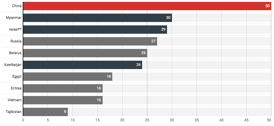རྒྱལ་སྤྱིའི་གསར་འགོད་པ་སྲུང་སྐྱོབ་མཐུན་ཚོགས་ཀྱིས། ཕྱི་ལོ་ ༢༠༢༥ ལོའི་གསར་འགོད་རང་དབང་གི་སྙན་ཐོ་འདོན་སྤེལ་བྱས་པ་ལྟར་ན། ཕྱི་ལོ་ ༢༠༢༥ ཡི་ལོ་མཇུག་བར་འཛམ་གླིང་ཡོངས་སུ་གསར་འགོད་པ་ཁྱོན་ ༣༣༠ བཙོན་འཇུག་བྱས་ཡོད་ཅིང་། གསར་འགོད་པ་བཙོན་འཇུག་བྱེད་དོན་གཙོ་བོ་ནི་འཛམ་གླིང་ནང་སྲིད་དབང་སྒེར་གཅོད་པ་དང་དམག་འཁྲུག་མང་དག་ཅིག་འབྱུང་བཞིན་ཡོད་པས་ཡིན་སྐོར་བརྗོད་འདུག་ལ། རྒྱ་ནག་ནི་ཕྱི་ལོ་ ༢༠༢༥ ལོར་འཛམ་གླིང་ནང་གསར་འགོད་པ་བཙོན་འཇུག་བྱེད་མཁན་སྡུག་ཤོས་དེ་ཡིན་པ་མ་ཟད། འདས་པའི་ལོ་གསུམ་བསྟུད་མར་གསར་འགོད་པར་དྲག་གནོན་བྱེད་མཁན་གྱི་རྒྱལ་ཁབ་སྡུག་ཤོས་དེ་ཡིན་འདུག