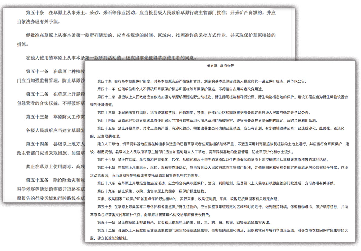 རྒྱ་ནག་གི་རྩྭ་ཐང་ཁྲིམས་དོན་ཚན་ ༥༠ དང་ ༥༡། ༥༢ སོགས་དང་། མཚོ་སྔོན་ཞིང་ཆེན་གྱི་རྩྭ་ཁྲིམས་ལག་བསྟར་བྱེད་ཐབས་ཀྱི་དོན་ཚན་ ༤༧ པའི་ནང་དུ། རྩྭ་ཐང་དུ་ས་བརྐོ་རྡོ་སློག་དང་། གཏེར་ཁ་སྔོག་འདོན་སོགས་ཀྱི་བྱ་བ་རྩོམ་པར་ཐོག་མར་རྫོང་རིམ་པའི་མི་མང་སྲིད་གཞུང་གི་རྩྭ་ཐང་སྲིད་འཛིན་དོ་དམ་ཁང་གི་ཆོག་མཆན་དགོས་པ་མ་ཟད། རྒྱལ་ཁབ་དང་ཞིང་ཆེན་གྱི་འབྲེལ་ཡོད་ཐག་གཅོད་ལྟར་རྩྭ་ཐང་བདག་གཉེར་བར་གུན་གསབ་སྤྲོད་དགོས། ལས་དོན་འགྲུབ་རྗེས་དུས་བཅད་ནང་སྔོ་ཁེབས་སླར་གསོ་བྱེད་དགོས། ཡང་ན་རྩྭ་ཐང་དོ་དམ་ལས་ཁུངས་ལ་སླར་གསོའི་བྱ་བ་བཅོལ་འཇོག་དགོས་པ་བཀོད་ཡོད་པ་རེད། ཡིན་ནའང་། རྩྭ་ཐང་གི་ཁྲིམས་ནང་བཀོད་པ་འདི་དག་ལག་བསྟར་མ་བྱས་པར་གང་འདོད་དུ་ཞིང་འབྲོག་མང་ཚོགས་ཀྱི་རྩྭ་ས་བཙན་འཕྲོག་དང་གནས་སྤོར། རྩྭ་སའི་བདག་པོ་རྒྱལ་ཁབ་ཡིན་ཚུལ་བརྗོད་དེ་འཛུགས་སྐྲུན་ལས་རིགས་བརྩམས་ཏེ་གནོད་སྐྱོན་གཏོང་བཞིན་ཡོད་པ་རེད།