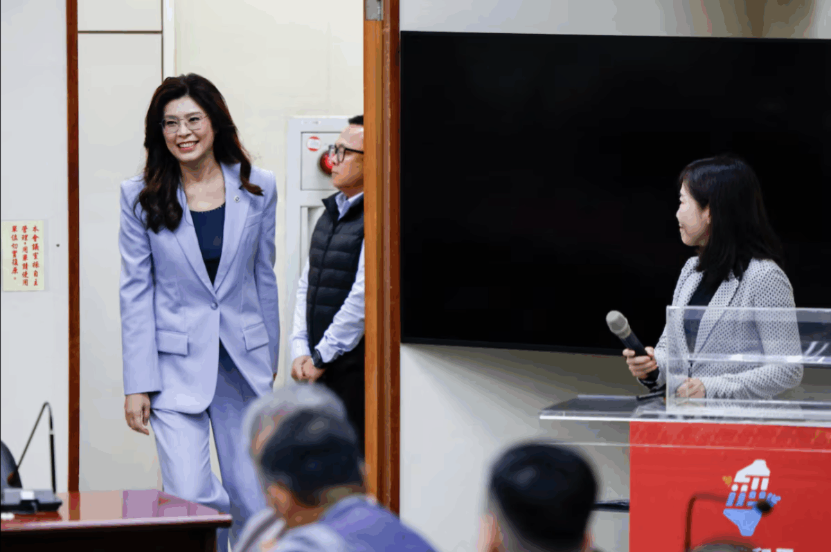 Kuomintang (KMT) Chairperson Cheng Li-wun arrives to speak to the media in Taipei before departing for China on April 7. © Reuters