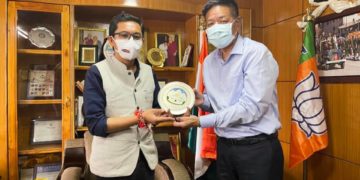 Tibetan settlement officer Lhakpa Tsering with Shri Arbail Hebbar Shivram, Minister of Karnataka State. Photo:tibet.net